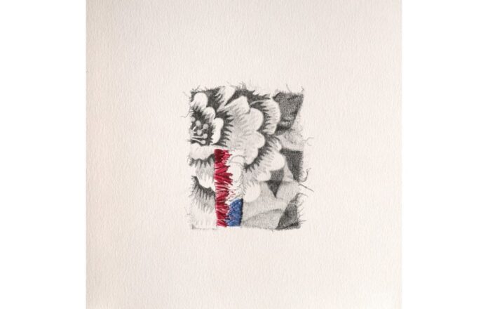 Mais do que representar a matéria, as obras partem dela como memória e repertório visual. Marcada por cores vibrantes e estampas florais, a chita surge como ponto de partida para investigações sobre identidade e tempo. Esse material ocupa um lugar central no processo da artista: associado à cultura popular brasileira, ao ambiente doméstico e ao universo feminino, carrega uma visualidade intensa que atravessa gerações. Ao trazê-lo para o campo do desenho e do bordado, Rita de Souza não apenas recupera sua força simbólica, mas também tensiona sua fragilidade. O que antes era superfície contínua se desfaz, se fragmenta e se reorganiza em novas composições. As cores, ainda que muitas vezes sugeridas mais do que explícitas, permanecem como memória visual, evocando a presença vibrante da chita mesmo quando ela já não está inteira.