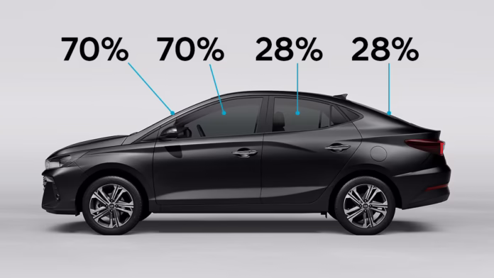 - A transparência mínima exigida para os vidros que não interferem na dirigibilidade do veículo, como os laterais traseiros e o traseiro, é de 28%. Essa regra não mudou;